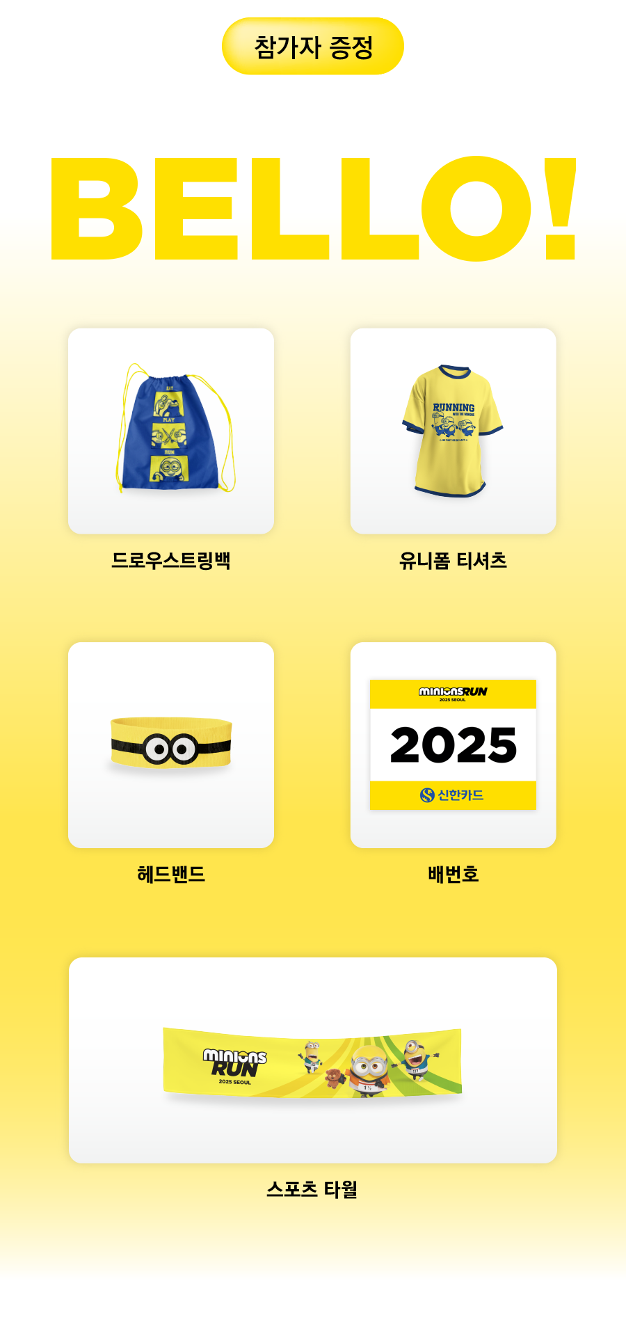 2025 미니언즈 마라톤, 단순한 달리기를 넘어 특별한 추억을 남길 수 있는 최고의 캐릭터 행사입니다. 아이와 함께, 연인과 함께, 친구들과 함께! 올해는 귀여운 미니언즈와 함께 달려보세요!